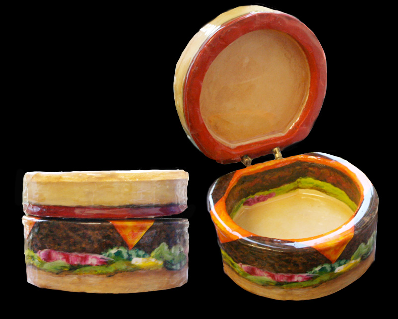 This is a hamburger box. Not much to say. It is made from a wooden box from Michael's, sanded and shaped, painted with acrylic paint, topped with real sesame seeds, and sealed with resin.