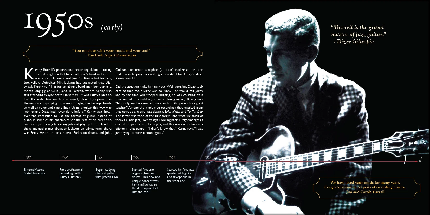 I had the honor of designing a tribute booklet for legendary Jazz guitarist Kenny Burrell's 75th birthday concert at UCLA's Royce Hall. Representing his prolific amount of music and accomplishments, starting from the fifties. It was no easy task!