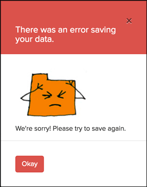 This little red error modal appeared when something went wrong in the validation process. The message reassured the user that it wasn't their fault, took responsibility for the error, acknowledged the frustration it caused, and asked them to save again.